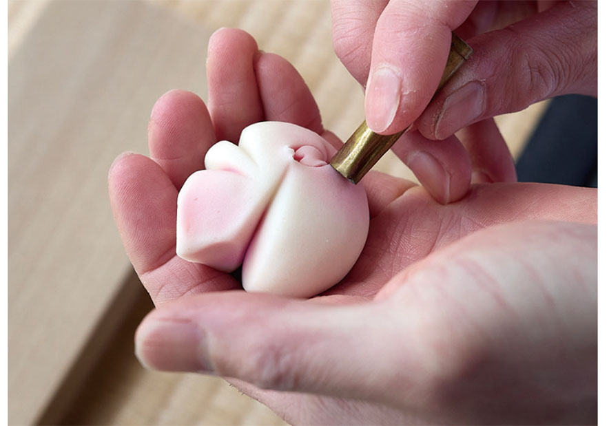これら上生菓子をはじめとした和菓子の意匠はあくまでシンプルに。色は練り込んでから形を整え、後から装飾を重ねすぎません。丸みや配色の重なりによって豊かな表情を生み出します。練り切りは口の中で優しくほどけ、年齢を問わず楽しめる味わい。可愛らしさの奥には確かな職人技が静かに輝きます。