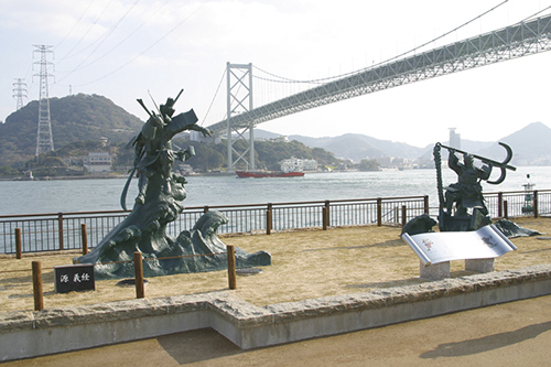 壇ノ浦古戦場址に建つ、八艘飛びの義経と碇をかつぐ知盛の『源義経・平知盛像』(山口県下関市みもすそ川町)