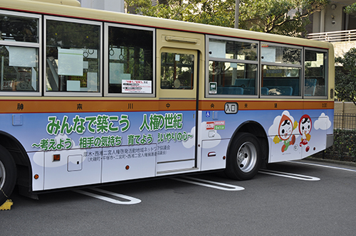 厚木・西湘二宮人権啓発活動地域ネットワーク協議会の地域活性化事業として、現在運行している人権啓発ラッピングバスの出発式が1日、大磯町役場駐車場で行われた。