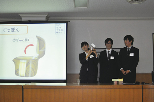 今年、同社のテーマに挑戦したのは東海大学、関東学院大学、国学院大学、文教大学、横浜市立大学(2チーム)、専修大学(2チーム)の6校8チーム。同社幹部や市内の金融機関支店長、高齢者専門看護師などの審査員を前に学生らは、それぞれの「新商品」をプレゼンテーション形式で発表。力をかけずに高齢者でも簡単に開けられる形状やプランターとして再利用できる容器など、学生ならではのユニークな発想に対し、それぞれ審査員による講評が行われた。