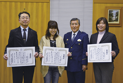 感謝状を贈られたのはローソン平塚紅谷町店店長・長嶋政枝さん(51)、同平塚四之宮一丁目店オーナー・石黒達也さん(58)、同花水店店長・内山直美さん(37)の3人。詐欺の手口はいずれも医療費還付を装ったもので、市役所職員を騙り社会保険事務所へ電話をかけさせ、犯人によるATMでの操作指示に従ううちに相手先の口座に現金を振り込んでしまうというもの。長嶋さんは過去にも2度、詐欺を未然に防いだことがあり「年配の人が真っ直ぐATMに向かっていくのはあまりない、特に携帯電話片手に大声で話しながらなどは気にかかる」と話す。