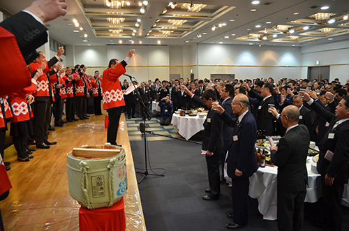 平塚市内では、平塚商工会議所主催の「新年賀詞交歓会」が6日、ラスカホールで開催された。会には落合克宏平塚市長や河野太郎代議士をはじめ県議会議員、市議会議員、市内経営者ら総勢約370人が参加。会場では毎年恒例の「年男・年女」による樽酒の鏡開きも行われた。