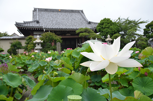 同寺で蓮を育て始めたのは15年ほど前のこと。守屋住職が鎌倉のお寺から紹介され、苗をもらい受けたことがきっかけだったという。「仏様は蓮の上に乗っていますし、蓮はお寺と縁がありますからね。また、泥沼から咲き出してきれいな花をつけるということで、人間もどんなに悪い環境であっても清らかに生きなさいという教えもあります」と守屋住職。こうして蓮を育てることが始まり、毎年色とりどりに咲く花は、多くの人の目を楽しませる恒例のものとなった。