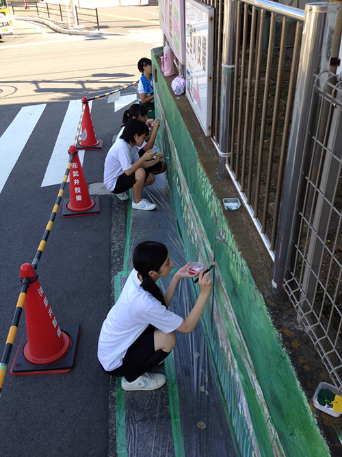 作業に参加した生徒は「前から大きいキャンパスに絵を描きたいと思っていた。壁画用の塗り方も先生が教えてくれて上手く描けたと思う」と満足げな表情を見せた。