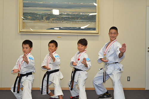 延べ4000人以上が出場し空手の技を競い合う小学生・中学生全国空手道選手権大会で優秀な成績を収めた平塚神空会の門下生ら4人が1日、大会の報告に落合克宏平塚市長を表敬訪問した。