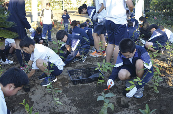今回の植樹も「夕陽ヶ丘」との愛称で呼ばれている同校グラウンド海側に位置する場所で行われ、サイエンス部や環境活動に取り組むISO委員会をはじめ、今年はグラウンドを使用する野球部、サッカー部の生徒らも参加し、タブ、アラカシ、シラカシなどの苗木27種1255本が植えられた(前回は25種500本)。野口校長は「自然に接する機会があるようでない今の子どもたちにとって、植樹し、学校生活の中で共に育っていくというのはとても良い経験になると思います」と期待を寄せている。