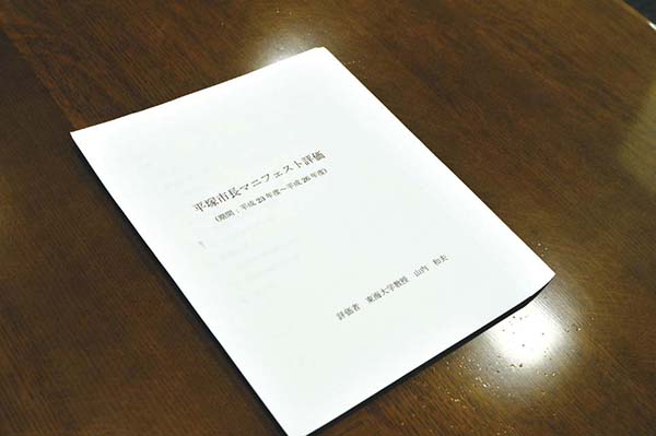 落合克宏平塚市長は18日、自身が初当選を果たした平成23年4月の市長選で掲げていたマニフェストについて、外部の政治学研究者に実現率を評価してもらう「平塚市長マニフェスト評価」の結果を公表した。評価を担当したのは、大藏律子前市長も任期中に同様の評価を委託した東海大学政治経済学部の山内和夫教授(政治学博士)。