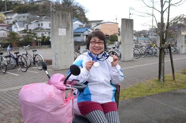 自分が変わるきっかけとなったのは50歳の時のこと。二宮町身体障害者福祉協会の前会長に誘われ、同協会へ入った。最初はリハビリのつもりで、会の仲間とカラオケに行く程度だった。もちろん上手くは歌うことはできない。だが歌詞を目で追うことで目の運動になり、頑張って歌おうとすることで声が出るようになった。そしてそのうちに、人と話せるようになっていった。そんな中、障がい者を対象とする陸上の県大会に出場しないかとオファーがあった。前向きな気持ちではなかったが、前会長から「とにかく出れば良いのよ」と背中を押され、2012年5月の大会で初めて50mに出場した。練習など全くしなかった。だが、出てみたら大会新記録の金メダル。その流れで翌年の大会にも出場し、50mに加えソフトボール投にも挑戦した。練習はしなかった。だが50mは2度目の金。ソフトボール投げも、初の金。本来右利きだが、右半身麻痺のため左手で投げたにも関わらず、だ。そして昨年の県大会でも両種目1位となったことで県代表のお呼びがかかり、全国大会に出場した。