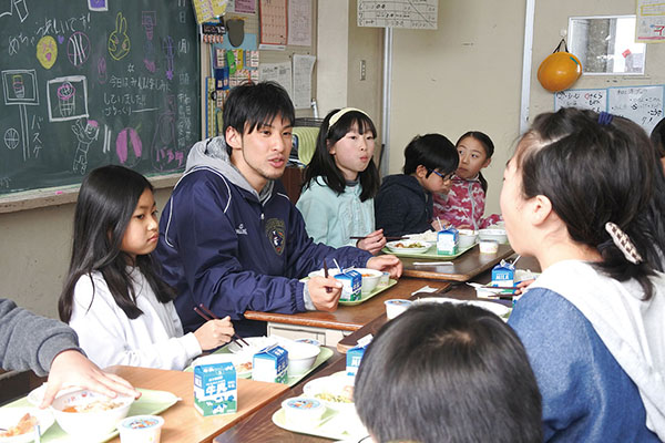 この日同小学校を訪れたのは、二宮町出身の細谷将司選手と満田丈太郎選手ら4人。ジャンプ力が高く粘り強い守備をする選手をイメージしたオクラと昆布入りのサラダや、体作りのため食事にこだわるという細谷選手が好きな豚汁などを4年生の児童と一緒に味わった。子どもたちは細谷選手から試合でのプレーの様子を聞いて、目を見張っていた。平塚総合体育館での同チームの試合は4月7、8日に行われる。