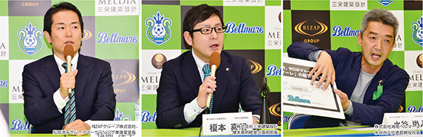 湘南ベルマーレ(眞壁 潔会長)は6日、フィットネスクラブを運営するRIZAPグループ株式会社(瀬戸 健社長)、ユニフォーム胸スポンサーの株式会社三栄建築設計(小池信三社長)との3社共同会見を都内で実施し、RIZAPと三栄建築設計による湘南ベルマーレの経営権取得についての発表を行なった。翌7日のホーム鹿島戦の前にはスタジアムで第三者割当増資に関する記者説明会を実施。水谷尚人湘南ベルマーレ社長ら3社の代表者が今後のクラブ経営、チーム運営などについて語った。