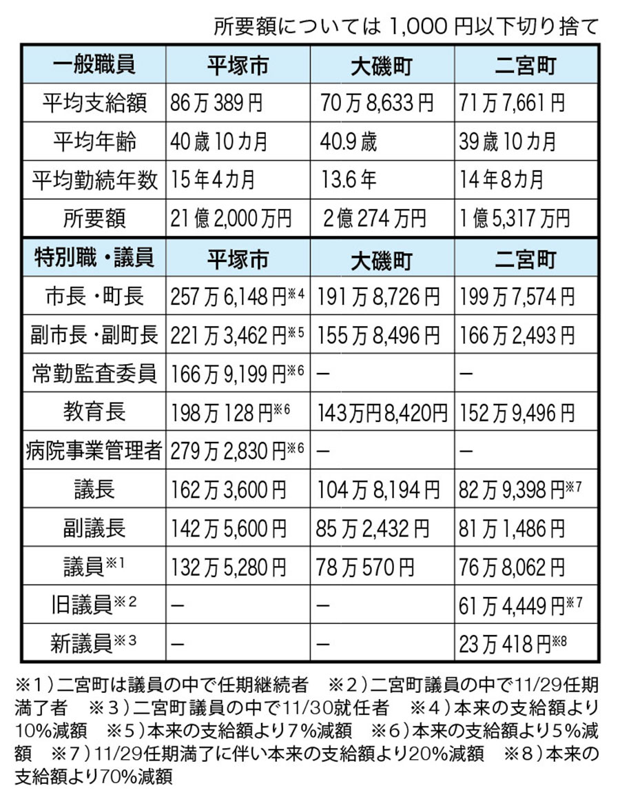平塚市、大磯町、二宮町ではこのほど、12月期の一般職員の期末勤勉手当と特別職員・議員の期末手当を支給した。一般職員の支給率は、平塚市が前年比0.1カ月増の2.325カ月、大磯町と二宮町が同0.05カ月増の2.275カ月。平塚市は3年連続で前年比増となった。