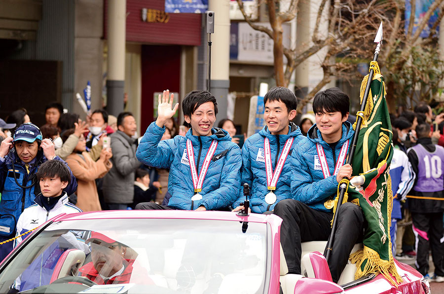 8区を走り最優秀選手にも輝いた小松陽平選手は集まった観客らの数に「いやー、ヤバいね!」と満面の笑み。「監督からは『箱根の優勝は孫の代まで自慢できる』と言われていたが、(自分は)その先の子孫にまで伝えられる」とユーモアを交えながら喜びを語った。