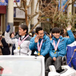 同大吹奏楽研究会の先導でオープンカー4台に分乗した両角速監督、V選手らが同商店街450mほどの道のりをパレード。笑顔で手を振る姿に沿道からは大きな声援と祝福が飛んだ。