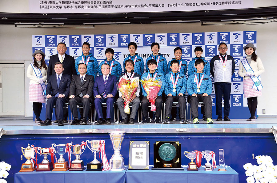 先月2日、3日に行われた第95回東京箱根間往復大学駅伝競走(箱根駅伝)で史上初の総合優勝を果たした東海大学の記念パレードと優勝報告会が同27日、同大の湘南キャンパス所在地である平塚市の湘南スターモール商店街、見附台広場で行われた。沿道には市民ら1万人が駆けつけ、過去46大会に出場した名門の悲願を祝った。