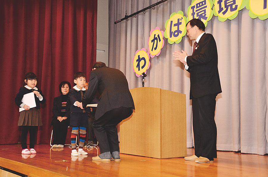 総合的に環境活動を実践する「わかば環境ISO」制度に取り組む学校や幼稚園の輪を広げている同市。同園では廃材や紙の裏面の利用などに加え、園内の落ち葉から腐葉土を作り、野菜や植物を栽培する食育活動や、廃材を利用しての親子の造形活動、七夕かざりの制作などの独自の取り組み項目が評価された。落合市長は「おうちの人と話をして、家族で環境を考えて」とメッセージを送った。