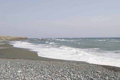 『海道記』の作者が見た大磯、小磯の浦の情景。波の上には橋のような雲が浮かんでいて、鵲(かささぎ。七夕の日には天の川に羽を並べて橋をかけるといわれる鳥)が大空に羽ばたいている。さびしいような空。ほかの旅人は、眺めることに馴れているのだろうか、通り過ぎていく。「大磯や小磯の浦の浦風に行くともしらずかへる袖かな」(私が東の方へ行くとも知らずに、大磯小磯の海辺の風に吹かれて西へ帰そうと後ろに翻る袖よ)。大磯小磯の浦の風景は、京からの旅人に感興を催させたのだった。旅人は足を止め、歌を詠んだ。【写真】大磯海岸