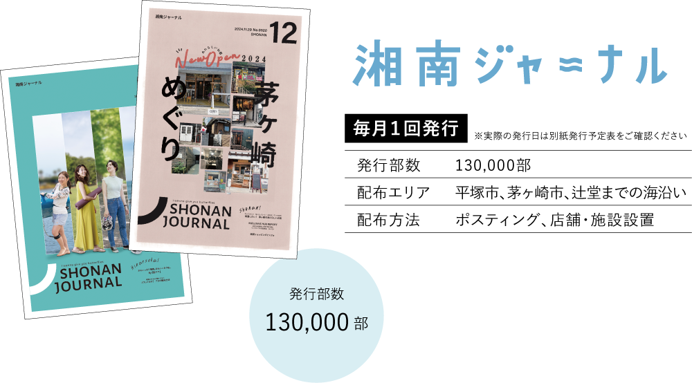 ■湘南ジャーナル 発行日:毎月1回 ・第1金曜日に発行 (例外あり) 発行部数:130,000部 配布エリア:平塚市・茅ヶ崎市、辻堂までの海沿い 配布方法:ポスティング、店舗・施設設置